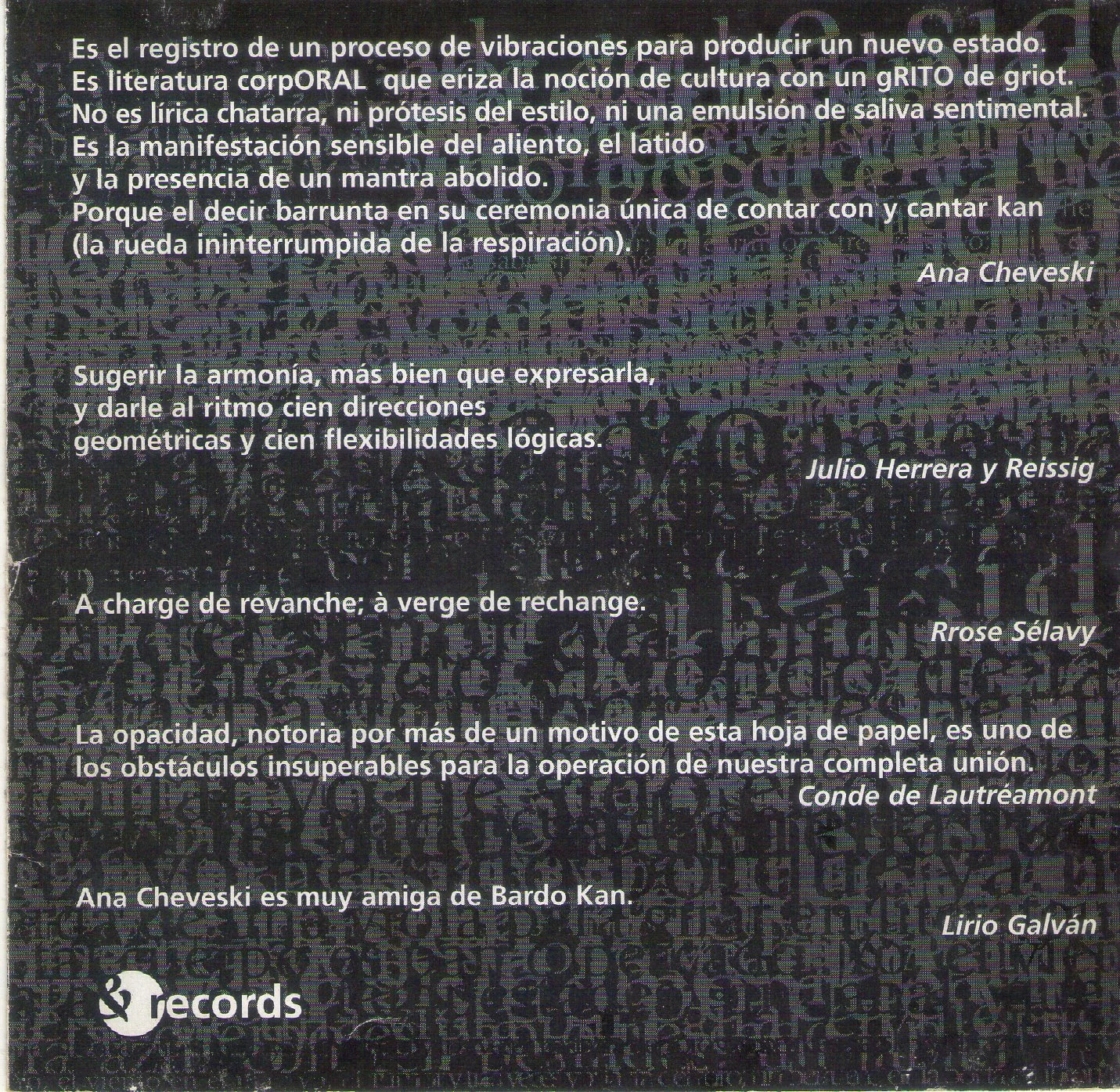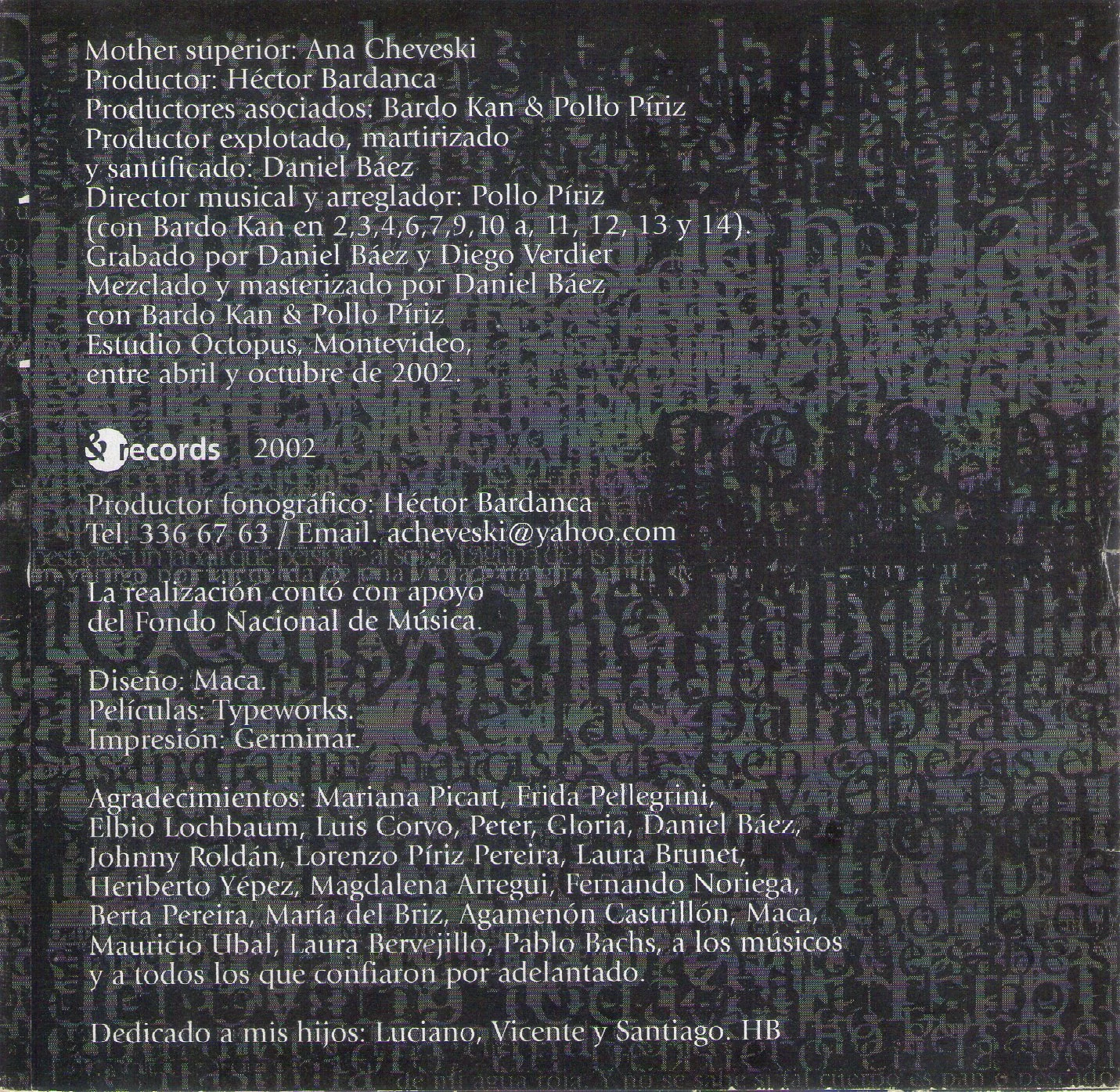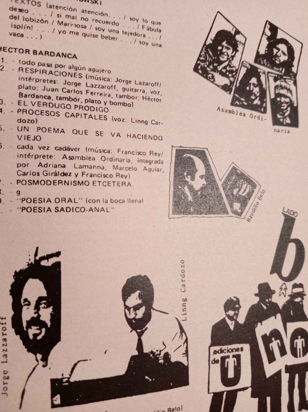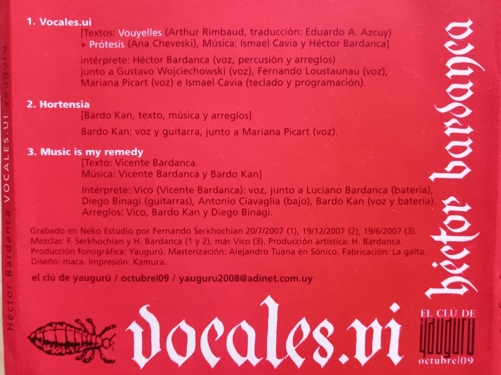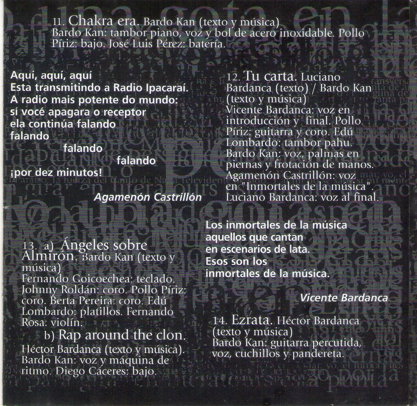 1 - Héctor Bardanca, escritor, músico, performer, editor y productor; nació el 12 de abril de 1954, en Montevideo. Tomó cursos de batería y percusión con Roberto Serrentino y José Luis Pérez, y de análisis mesomusical con Coriún Aharonián. Participó en el IX Curso Latinoamericano de Música Contemporánea, en Itapira, Brasil, 1980. Asistió a la primera Escuela de Cine de Cinemateca Uruguaya en 1977, así como a talleres literarios de Enrique Fierro y Hugo Achugar en los años 80. Completó curso de inglés en la Alianza Cultural Uruguay - Estados Unidos y realizó algunos estudios de portugués en el ICUB (Instituto de Cultura Uruguayo-Brasileño), y de francés en la Alianza Francesa.